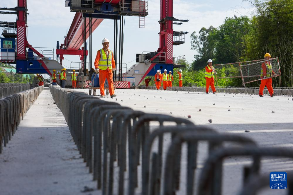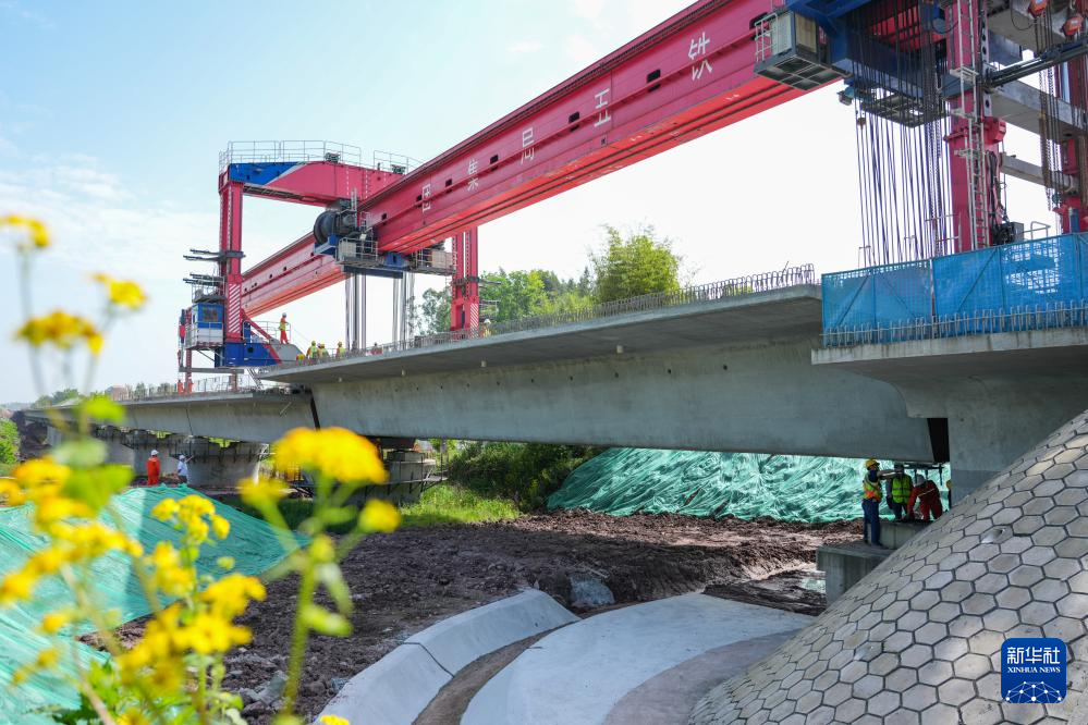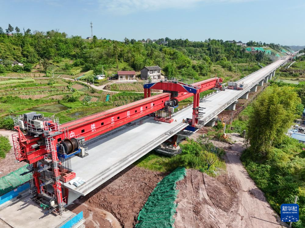 这是4月17日在四川省广安市境内拍摄的西渝高铁双碉楼特大桥架梁作业现场(无人机照片)。