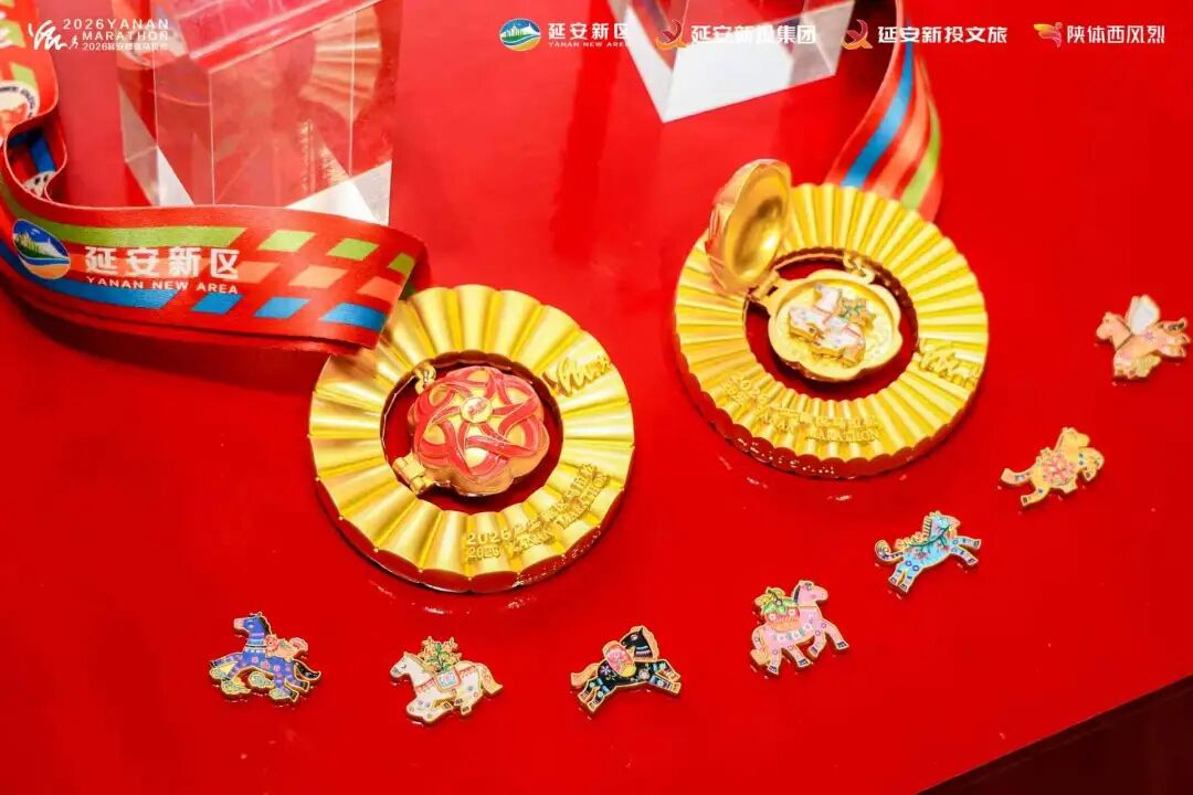 完赛奖牌匠心独运,内置八匹马盲盒冰箱贴,蕴含“马上有钱”“枣日PB”等美好祝愿;全马42个棱柱、半马24个棱柱设计独具匠心,红色缎带象征革命红绸,成为跑者珍藏的荣誉纪念。完赛浴巾印刻“延马的坡,也就那样”“跑马的我,真不简单”专属标语,完赛区特设酸菜面、剁荞面、胖婶沾沾等陕北特色美食区,让选手赛后尽享舌尖上的延安。