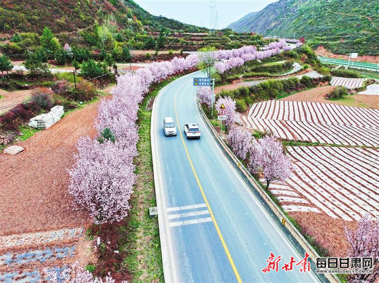 宕昌县南河镇境内的212国道沿途春意盎然,公路两边的紫叶李花竞相绽放。新甘肃·甘肃日报通讯员 刘辉