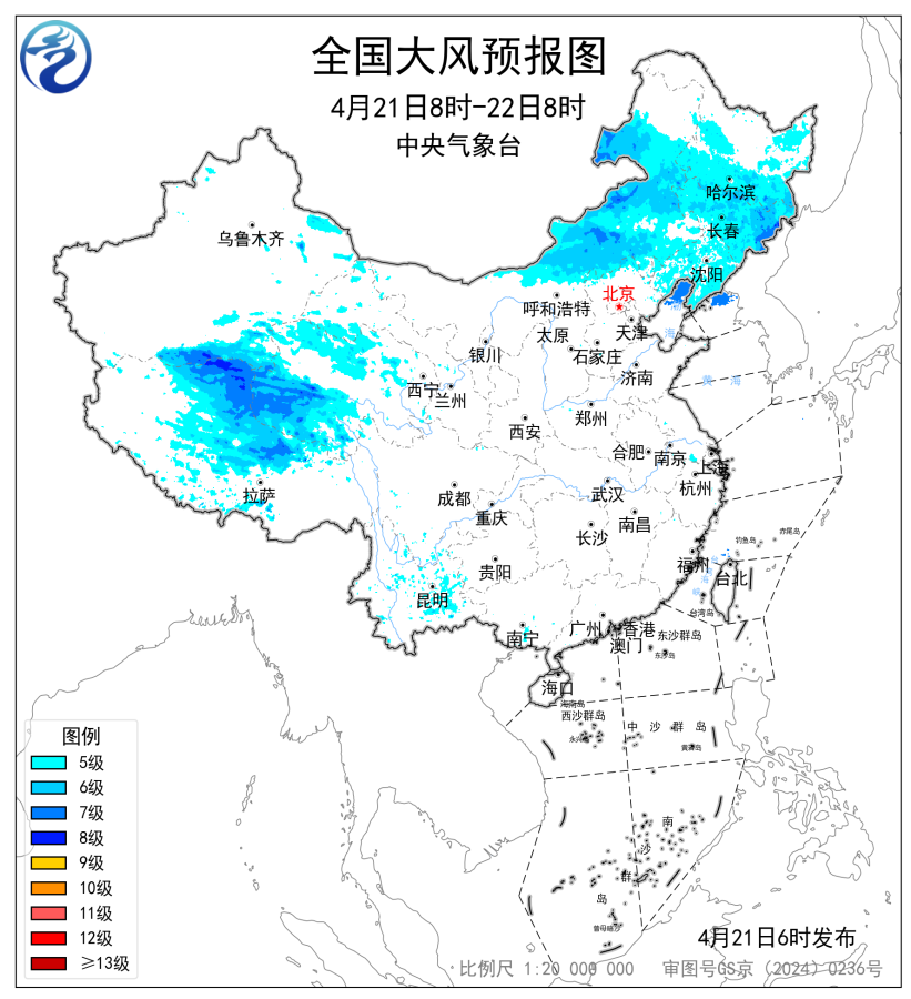 预计,4月21日08时至22日08时,内蒙古中东部、黑龙江中南部、吉林、辽宁以及新疆南疆盆地、西藏北部、青海西部等地部分地区有5~7级风,阵风8~9级,渤海北部海域、黄海北部海域将有7级、阵风8级的风。中央气象台4月21日06时继续发布大风蓝色预警。