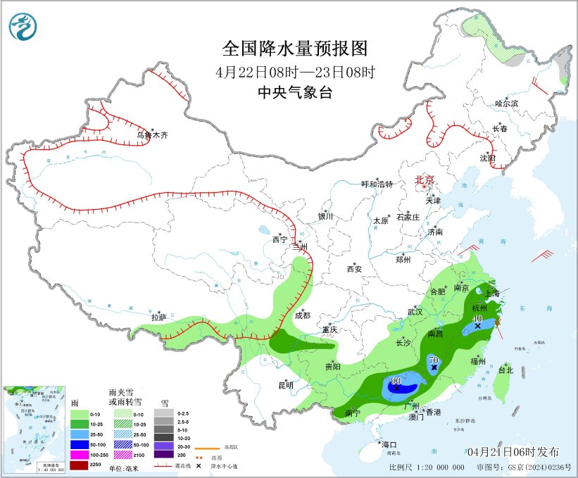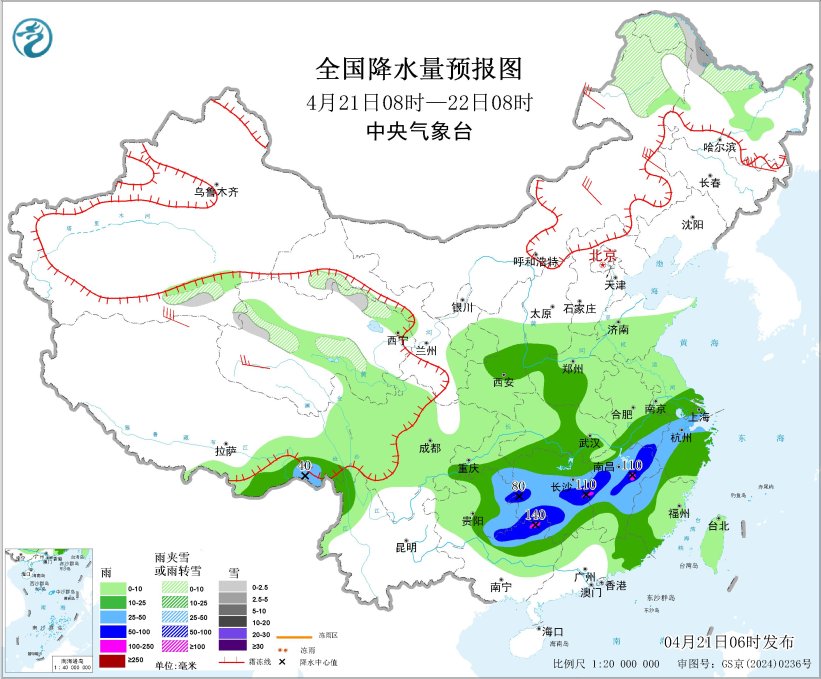 4月21日08时至22日08时,内蒙古东北部、黑龙江西北部、青海北部和西部、甘肃河西等地部分地区有小到中雪或雨夹雪。黄淮西部、江淮西部、江汉东部、江南大部、西南地区东南部、华南北部和东南沿海地区以及西藏东南部等地部分地区有中到大雨,其中,贵州东南部、湖南中南部、江西中北部、广西东北部等地部分地区有暴雨,局地大暴雨(100~140毫米)。内蒙古中东部、黑龙江中南部、吉林、辽宁以及新疆南疆盆地、西藏北部、青海西部等地部分地区有5~7级风,阵风8~9级,渤海北部海域、黄海北部海域有7级风、阵风8级。
