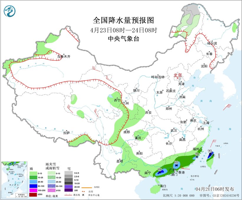 4月23日08时至24日08时,内蒙古东北部、黑龙江西北部等地部分地区有小雪或雨夹雪。广西东南部、广东中南部、福建东南部、台湾岛等地部分地区有中到大雨,局地有暴雨(50~90毫米)。内蒙古西北部、青海南部和西部、甘肃河西等地部分地区有4~6级风,东海北部有6~7级风、阵风8级。