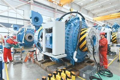 4月22日,在安徽省阜阳市阜合产业园内,某企业工人在车间进行风力发电设备零部件安装作业。