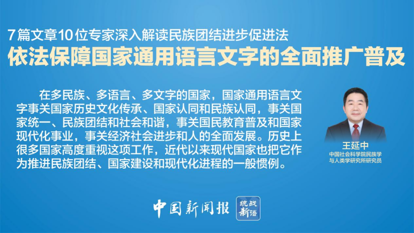 十四届全国人大四次会议审议通过的民族团结进步促进法明确规定,“国家全面推广普及国家通用语言文字。任何组织和个人不得妨碍公民学习和使用国家通用语言文字。”这不仅明确了国家通用语言文字的法律地位,而且规定了国家对“通用语言文字”承担“全面推广普及”的责任。