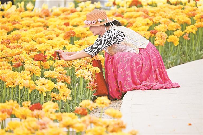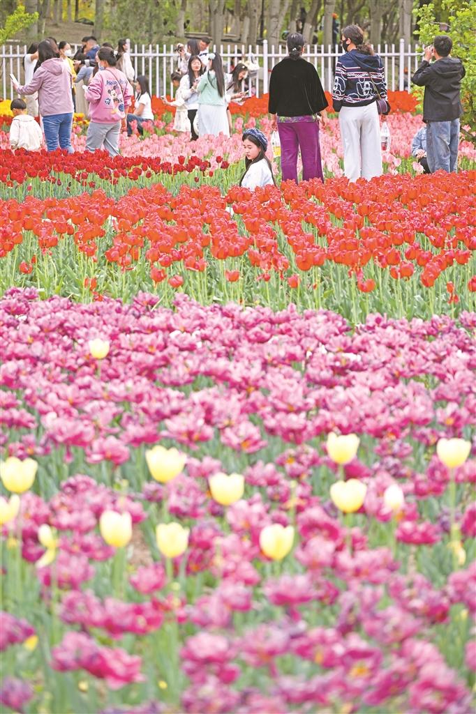 4月26日,银川市兴庆区海宝公园数万株郁金香迎来最佳赏花期,众多市民前来感受春日氛围。据银川市公园管理中心工作人员叶楠介绍,郁金香花期将持续至5月初,公园实行免费入园政策,市民无需门票即可赴约花海。