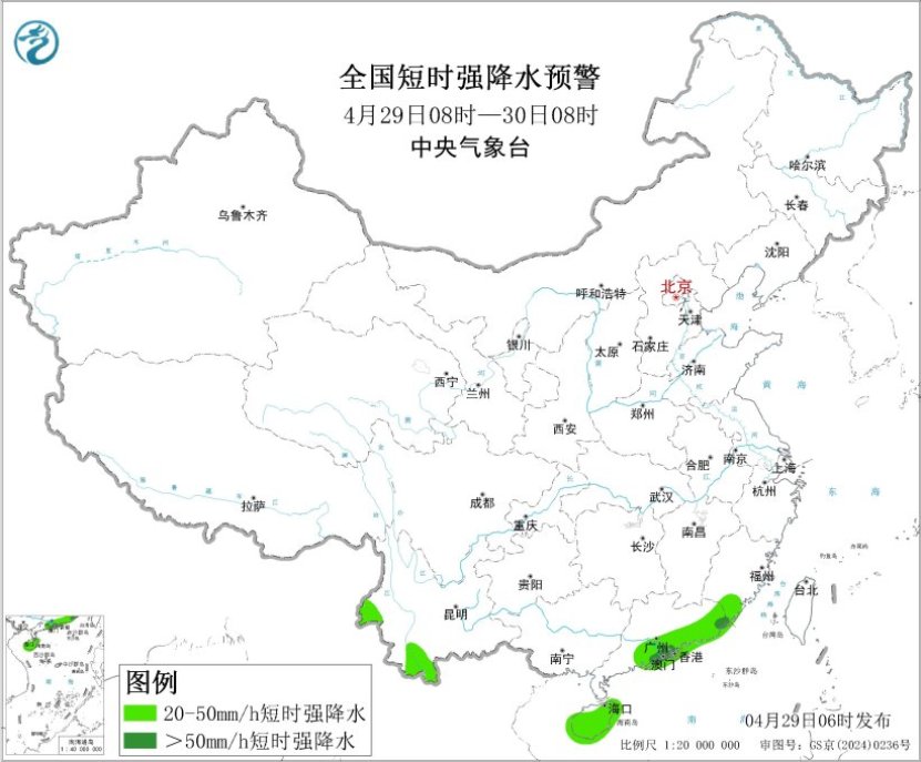 4月29日,江南东部、华南中东部和南部等地部分地区有中到大雨,局地暴雨。预计4月29日08时至30日08时,广东中南部、海南岛西南部等地的局地将有8级以上雷暴大风或冰雹天气;华南东南部、西南地区西南部等地的部分地区将有小时雨量大于20毫米的短时强降水天气,其中,广东中南部和西南部沿海等地的局地小时雨量大于50毫米,最大可达60毫米以上。预计,强对流的主要影响时段为今天白天。中央气象台4月29日06时继续发布强对流天气蓝色预警。