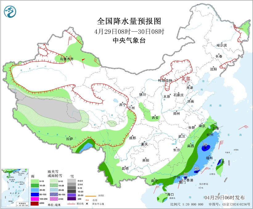 4月29日08时至30日08时,西藏北部和西部、青海南部等地部分地区有小雪或雨夹雪。西藏东南部、江南东部、云南西南部、华南东部和南部等地部分地区有中到大雨,其中,浙江南部、福建北部、广东东南部、台湾岛北部等地部分地区有暴雨(50~80毫米)。新疆沿天山地区和东部等地部分地区有5~6级风,其中,新疆东部部分地区有7~8级风。