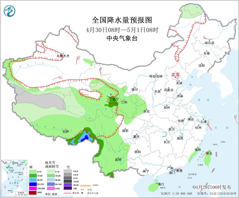4月30日08时至5月1日08时,内蒙古东北部、黑龙江西北部、西藏北部和西部、青海南部和西部等地部分地区有小雪或雨夹雪。西藏东南部、青海东部、云南西部等地部分地区有中到大雨,其中,西藏东南部等地部分地区有暴雨。新疆南疆盆地、青海北部、甘肃河西等地部分地区有4~6级风,其中,新疆东部部分地区有6~7级风。