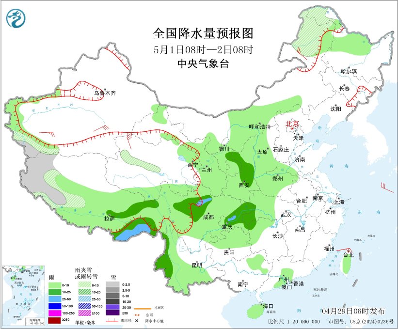 5月1日08时至2日08时,内蒙古东北部、西藏西部等地部分地区有小雪或雨夹雪。内蒙古西部、黑龙江西北部、西藏东部、甘肃河西、西北地区东部、江汉大部、西南地区大部等地部分地区有小到中雨,其中,西藏东南部、川西高原北部等地部分地区有大雨。内蒙古东北部、新疆南疆盆地、青海西部等地部分地区有4~6级风。