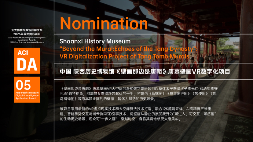 据介绍,本次奖项评审围绕创新性、实效性、可推广性三大核心维度综合考评。此次陕历博项目成功入围亚太权威奖项首批提名,既是对文物数字化创新成果的高度认可,也标志着文博力量正式登上国际交流舞台。