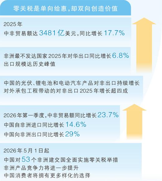 零关税举措不仅为世界经济增添确定性,也创新了南南合作范式。它嵌入中非共同发展经济伙伴关系协定的整体性制度框架,并将逐步扩展合作成果。零关税举措为非洲商品打开了中国市场的大门,但要实现“进得来、卖得好、走得远”,仍需系统性配套支撑,如升级农产品“绿色通道”,优化原产地规则,深化检验检疫与标准对接,完善物流仓储体系,拓宽市场渠道等。中非继续携手推进更便利的贸易、更具包容性的增长、更有韧性的供应链和更现代的发展领域等制度性安排,必将为共逐现代化之梦写下生动注脚。