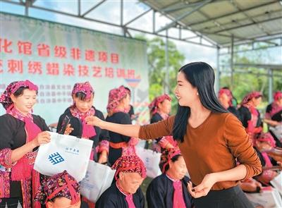 现在,映瑶工坊带动56名织娘绣娘就业,其中包括11名脱贫户;合作工坊5家,经营场地从2间小铺子扩到800平方米。我们还常年开展培训,进校园教孩子织锦,进景区让游客体验黎族纺染织绣技艺,前后培训了2800多人。