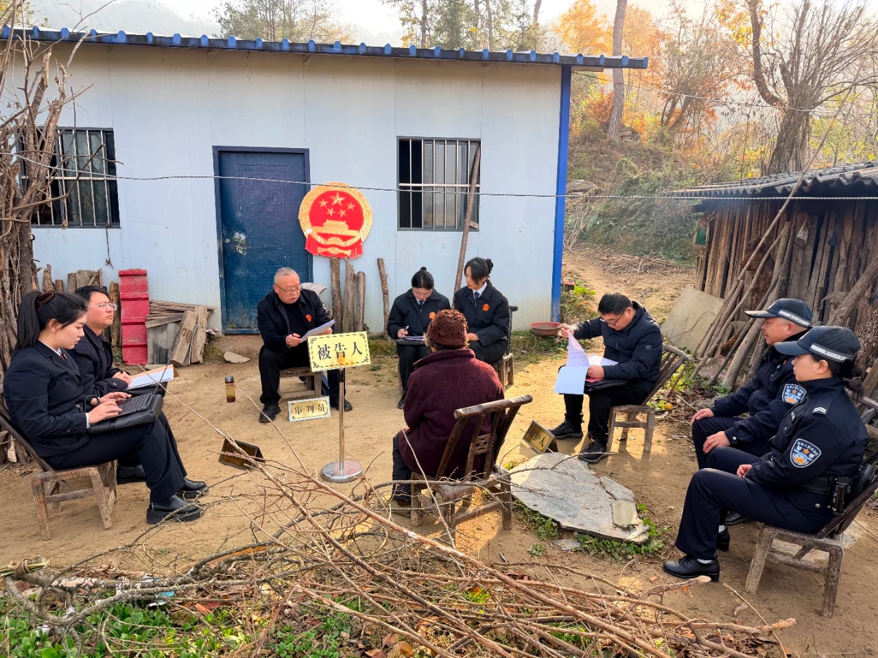 “现在开庭!”法槌声清脆响起,却不是在高悬国徽的审判庭,而是在一间朴素的农家屋外。鲜红的国徽高高悬挂,几张简朴的板凳,围成了庄重的审判区。法官、公诉人、辩护人围坐其中,一场严肃而特殊的庭审,在被告人家中正式开始。