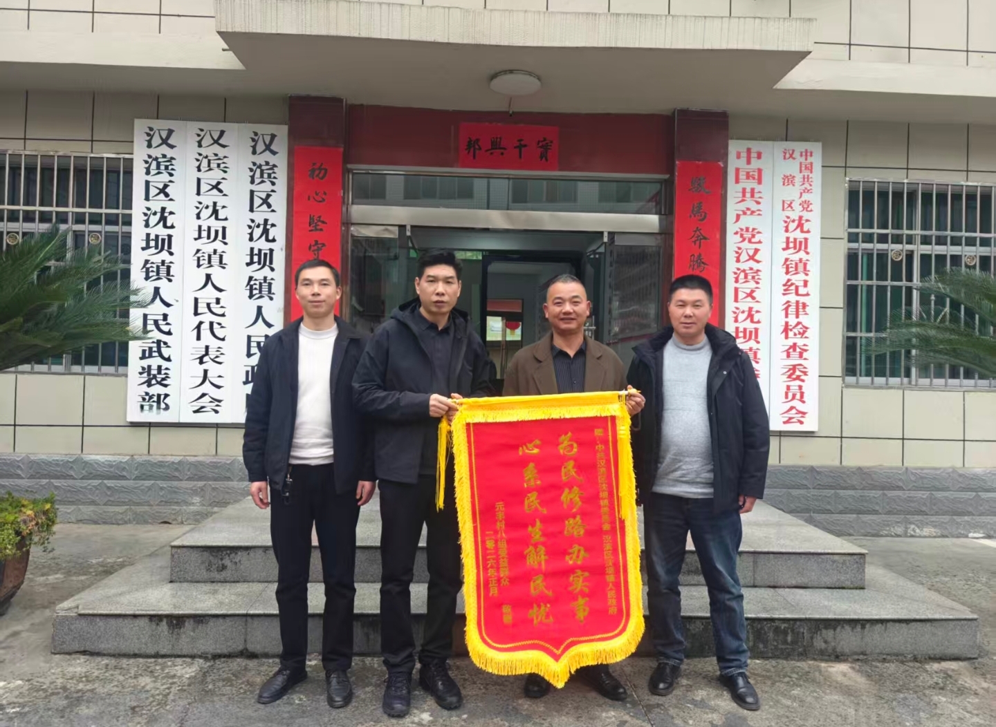 2月28日,汉滨区沈坝镇元丰村八组道路及堰渠沿线村民代表,将一面印着“为民修路办实事 心系民生解民忧”的锦旗和一封饱含深情的感谢信送到镇政府。