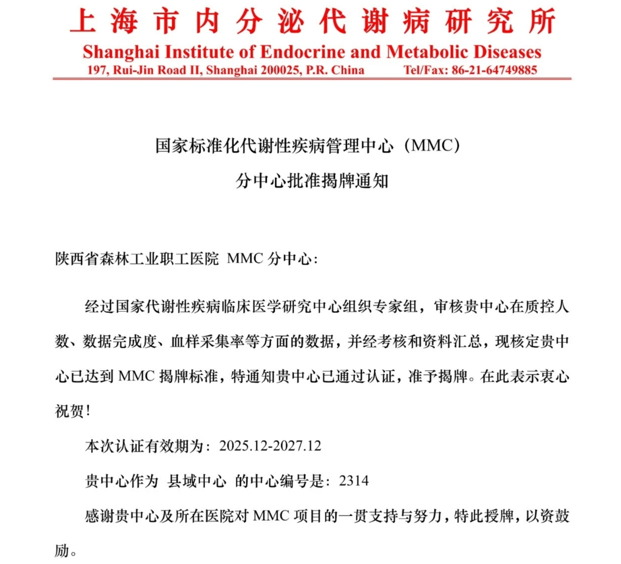 近日,陕西省森工医院代谢性疾病管理中心(MMC)通过了国家级认证。