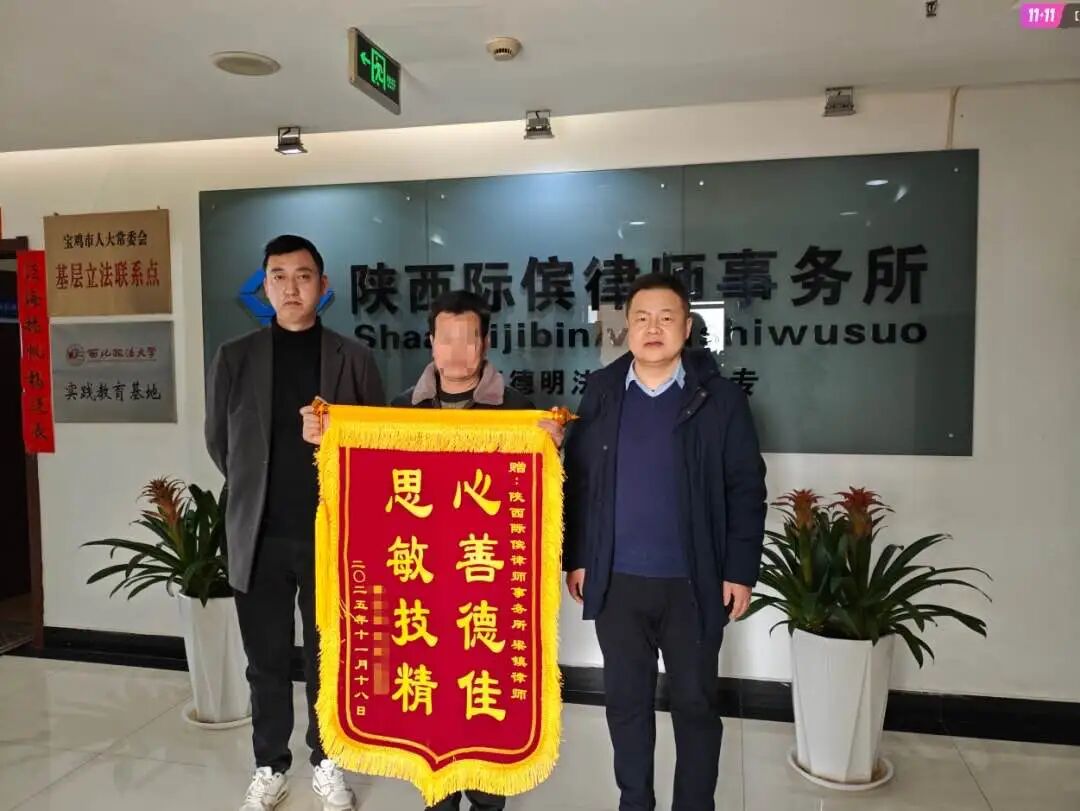 11月19日清晨,陕西际傧律师事务所的门前,一位中年男子紧握着梁镇律师的手,声音微微颤抖:"梁律师,太感谢你了!感谢太白县司法局派你来帮助我,这次要不是你们,我真的不知道该怎么办了。"说罢,他郑重地将一面绣有"法律援助暖人心 专业尽责解民忧"的锦旗递到梁律师手中。