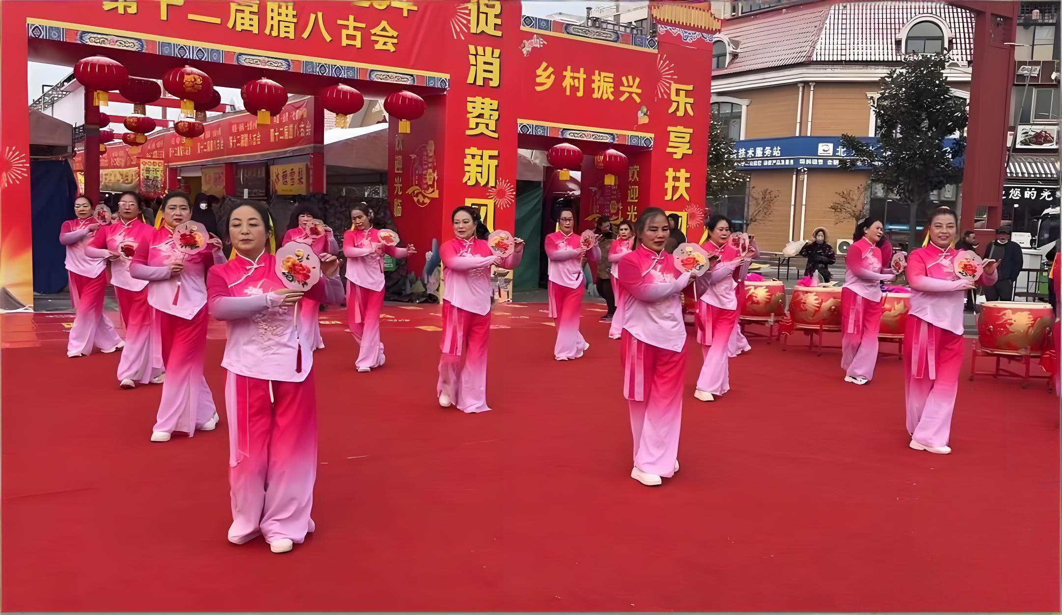 腊八时节,扶风县七星小镇的年集古会热闹非凡。在喧腾的人群与摊位之间,一抹流动而炽烈的“红”格外醒目——扶风县操舞协会木兰舞蹈队的成员们正身着红装,手持彩扇,随着激昂鼓点尽情舞动。