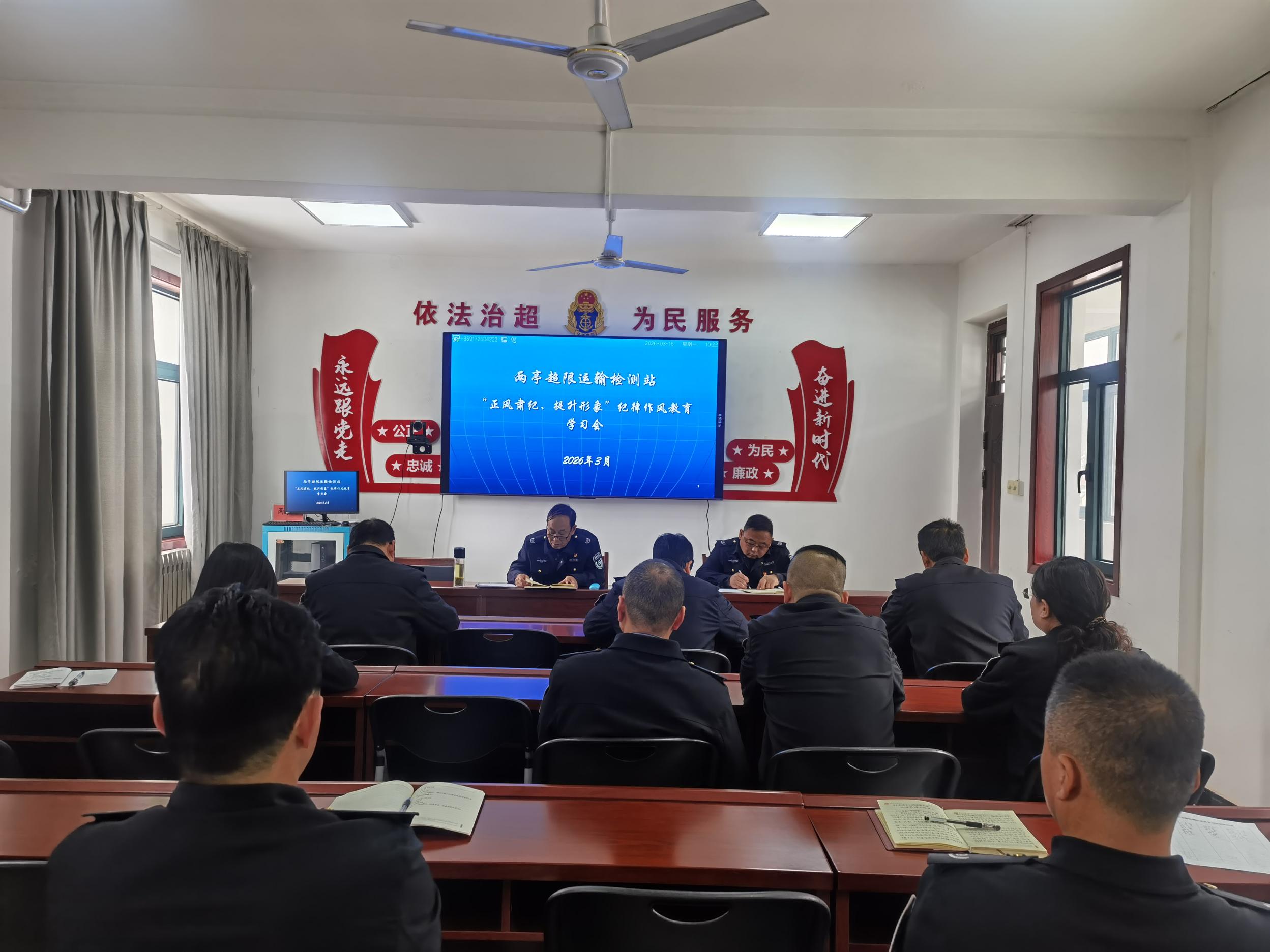 3月16日,宝鸡市公路局两亭超限站组织开展2026年第一季度业务知识与军事化管理考核,全站职工参加。