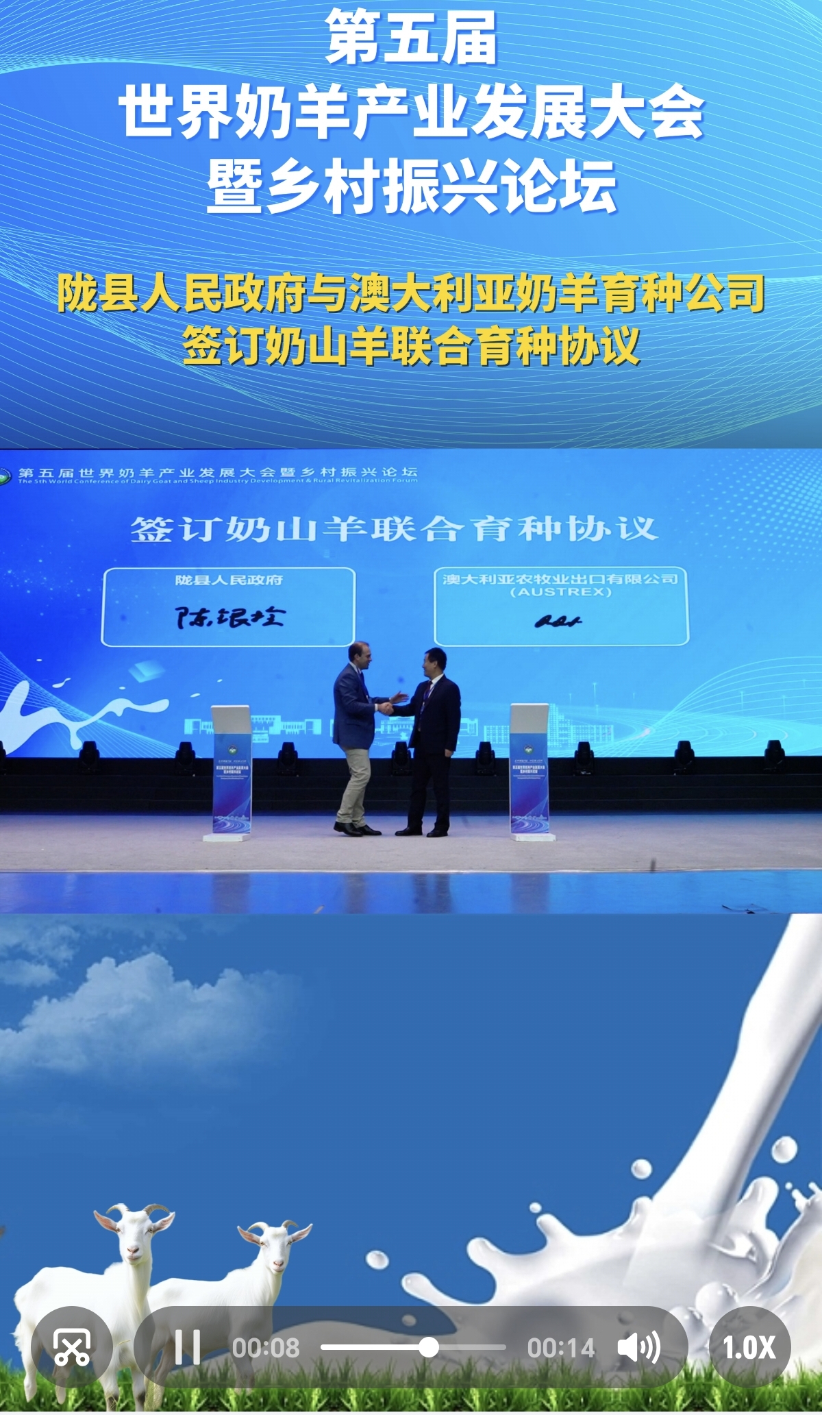 第五届世界奶羊产业发展大会暨乡村振兴论坛上,陇县人民政府与澳大利亚奶羊育种公司签订奶山羊联合育种协议