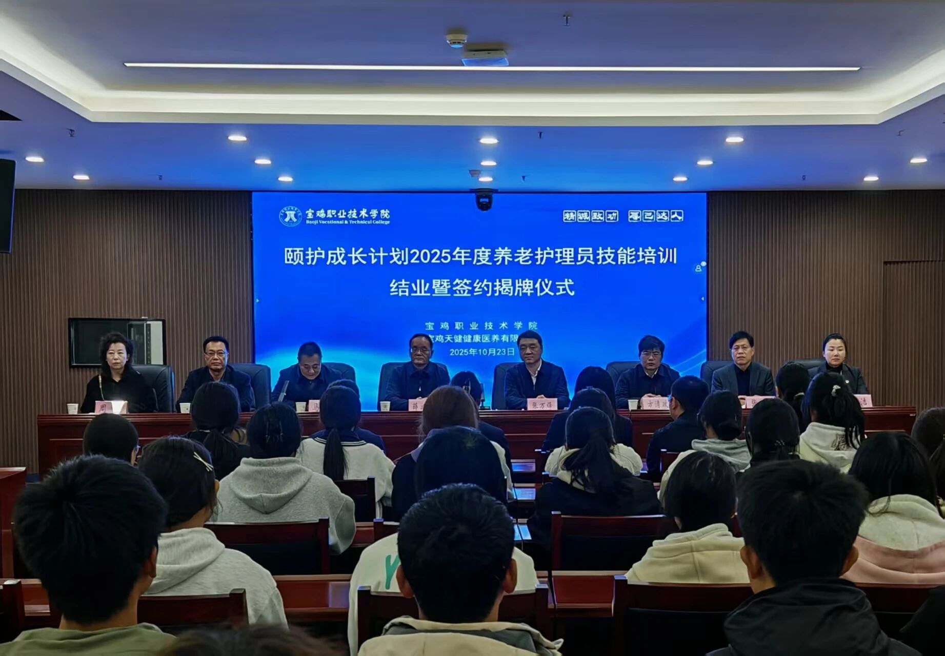 10月23日,天健医养公司颐护成长2025年度养老护理员技能培训结业暨签约授牌仪式在宝鸡职业技术学院凤起书院隆重举行。