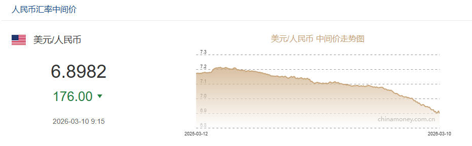 据中国外汇交易中心网站消息,中国人民银行授权中国外汇交易中心公布,2026年3月10日银行间外汇市场人民币汇率中间价为:1美元对人民币6.8982元,上调176个基点。