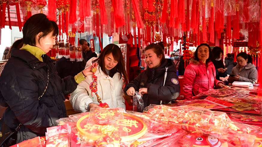 春节临近,陕西省西安市各大年货市场热闹非凡,琳琅满目的商品吸引众多市民前来选购。
