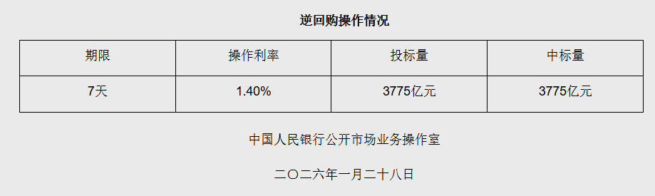 据央行网站消息,2026年1月28日中国人民银行以固定利率、数量招标方式开展了3775亿元7天期逆回购操作。