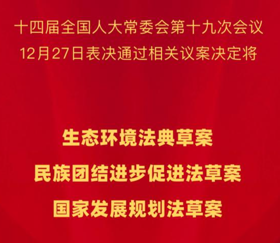 十四届全国人大常委会第十九次会议12月27日表决通过相关议案,决定将生态环境法典草案、民族团结进步促进法草案、国家发展规划法草案提请明年召开的十四届全国人大四次会议审议。