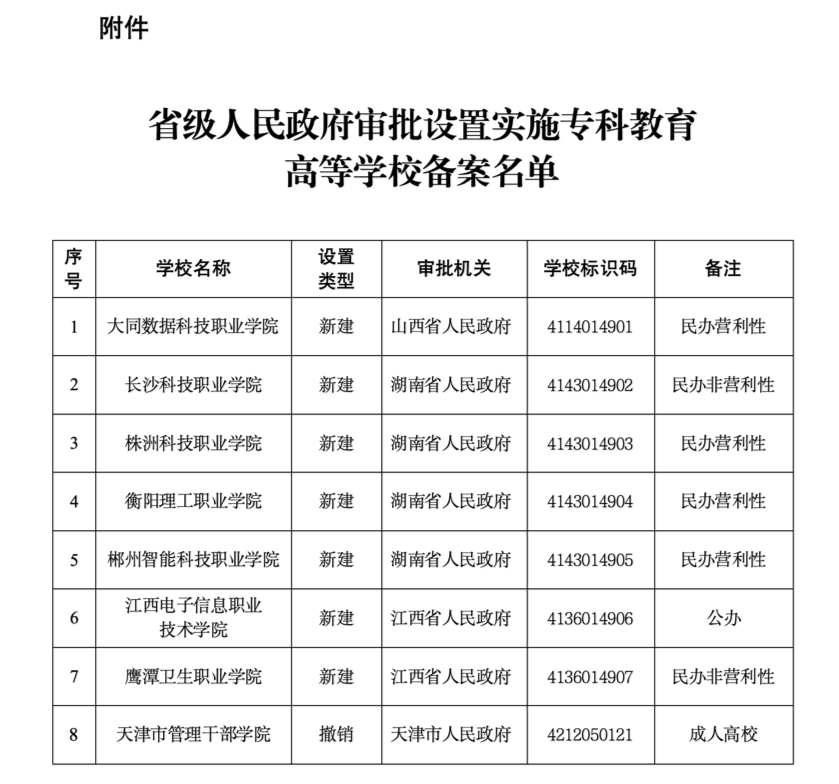 近日,教育部公布了2025年度第一批省级人民政府审批设置的专科层次高等学校备案名单。