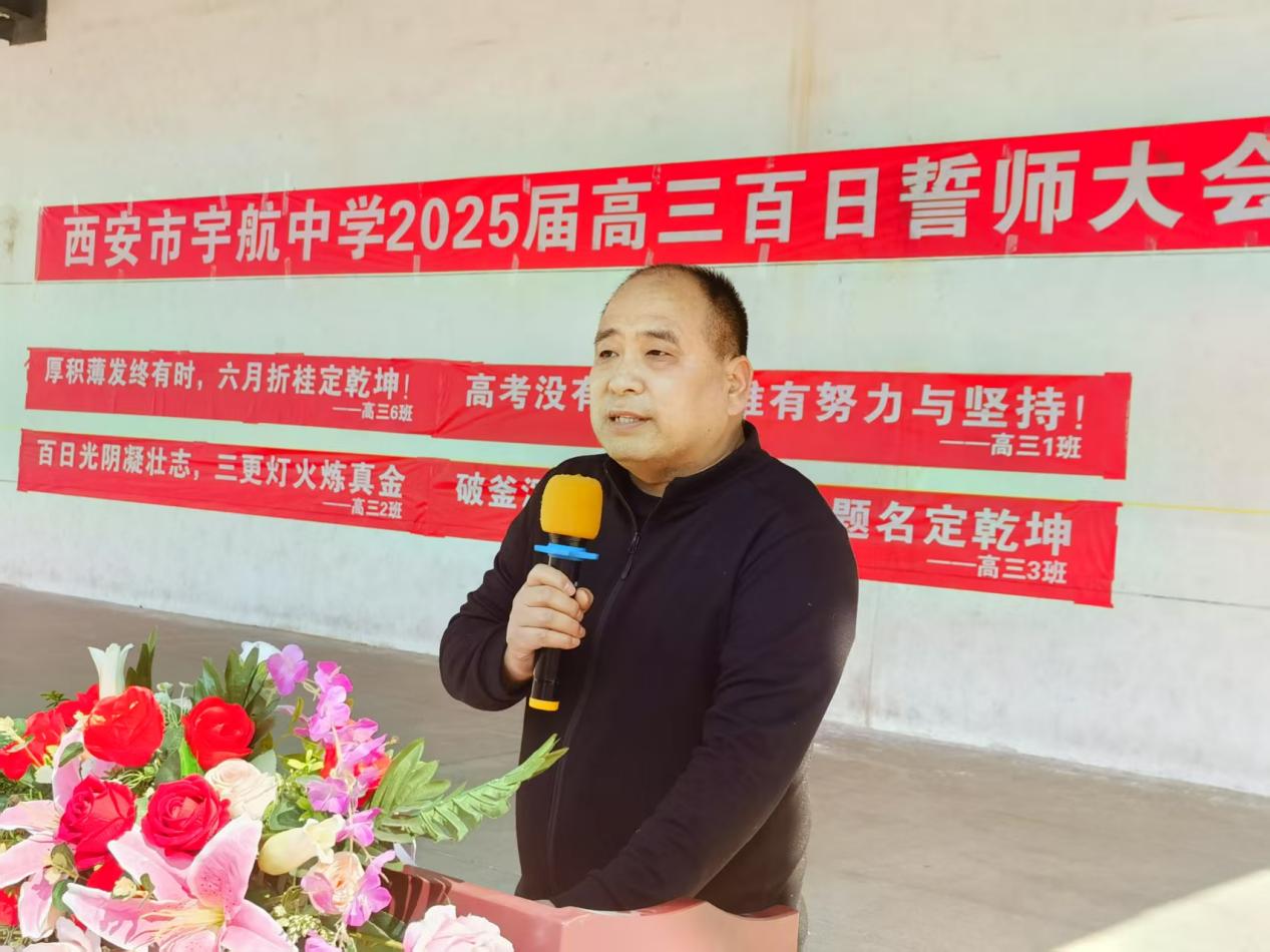 2月26日下午2点,西安市宇航中学的操场上彩旗飘扬,气氛热烈,该校2025届高考百日誓师大会在此隆重举行。高三年级组长赵晓龙老师主持会议,校领导、全体高三师生及家长代表齐聚一堂,共同见证这一激动人心的时刻。