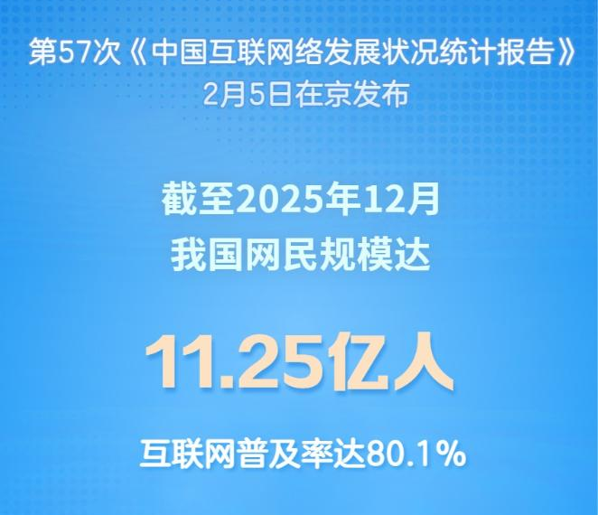 2月5日,第57次《中国互联网络发展状况统计报告》(以下简称《报告》)在京发布。《报告》显示,截至2025年12月,我国网民规模达11.25亿人,互联网普及率突破80%,数字发展成果惠及更广泛群体。