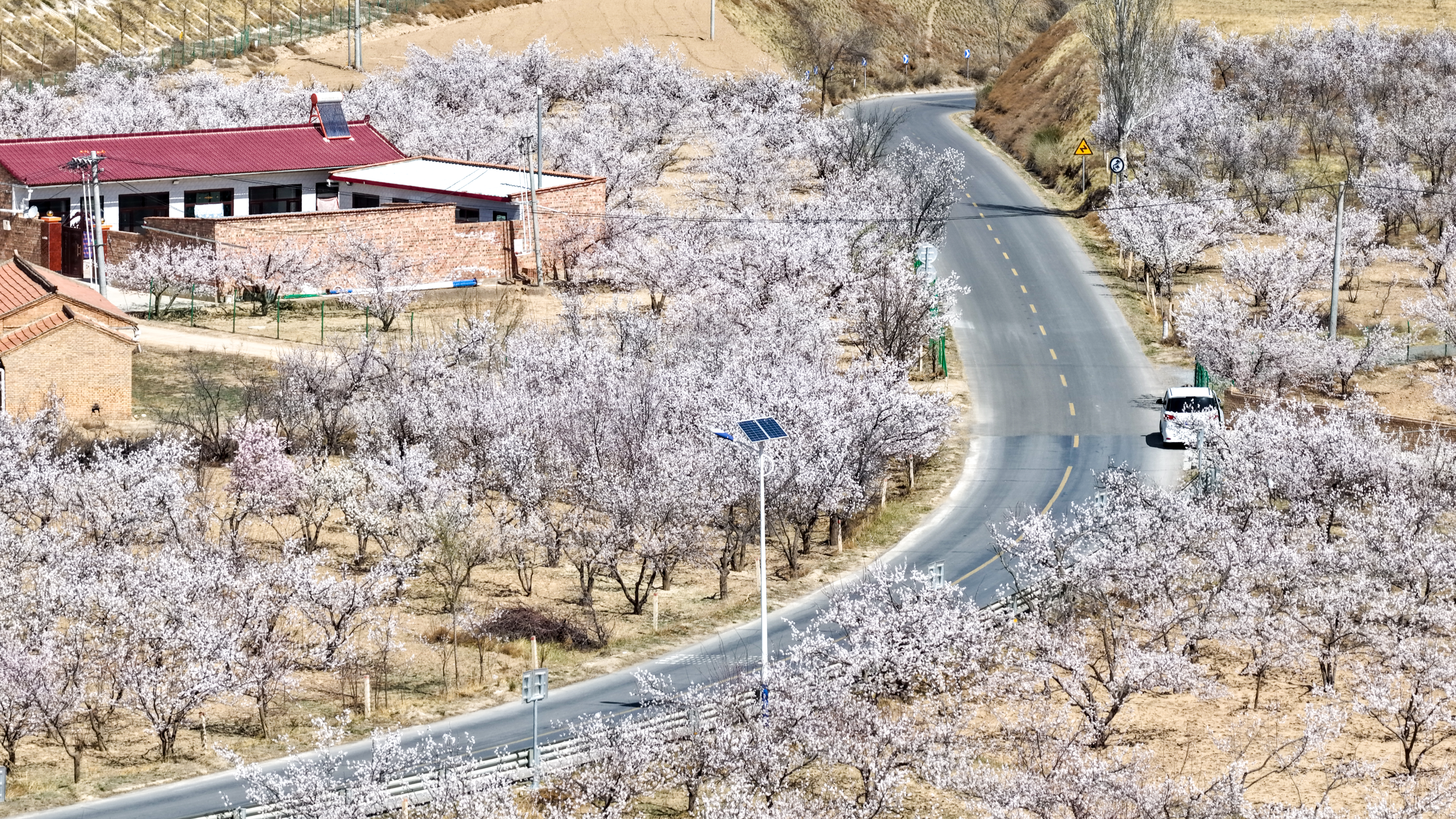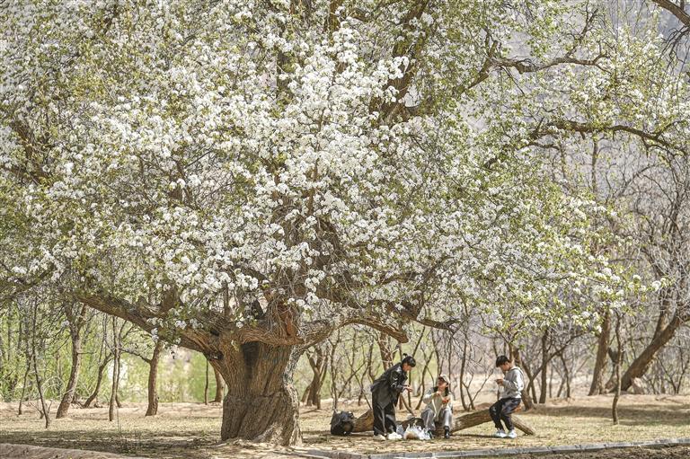 4月的黄河水裹着春汛的问候,在峡谷间奔腾不息,一路向东。上船、渡河,沿着蜿蜒的山路拐进中卫市沙坡头区迎水桥镇南长滩村,眼前豁然开朗——一片百年梨园,正把积蓄了一个冬天的力量,全部开成枝头的雪白。阳光从密密的花隙间筛落,空气里满是清甜的味道,远处的黄河在阳光下泛着金光,与这片白色花海相映成诗。这画面,像极了一幅厚重而温润的浮雕。