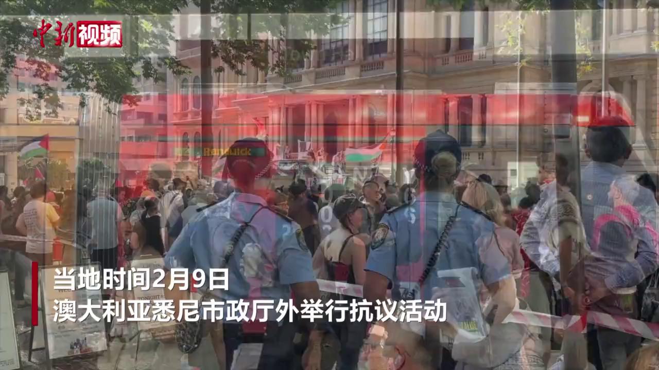 当地时间2月9日,澳大利亚悉尼市政厅外举行抗议活动,反对以色列总统赫尔佐格访问澳大利亚。