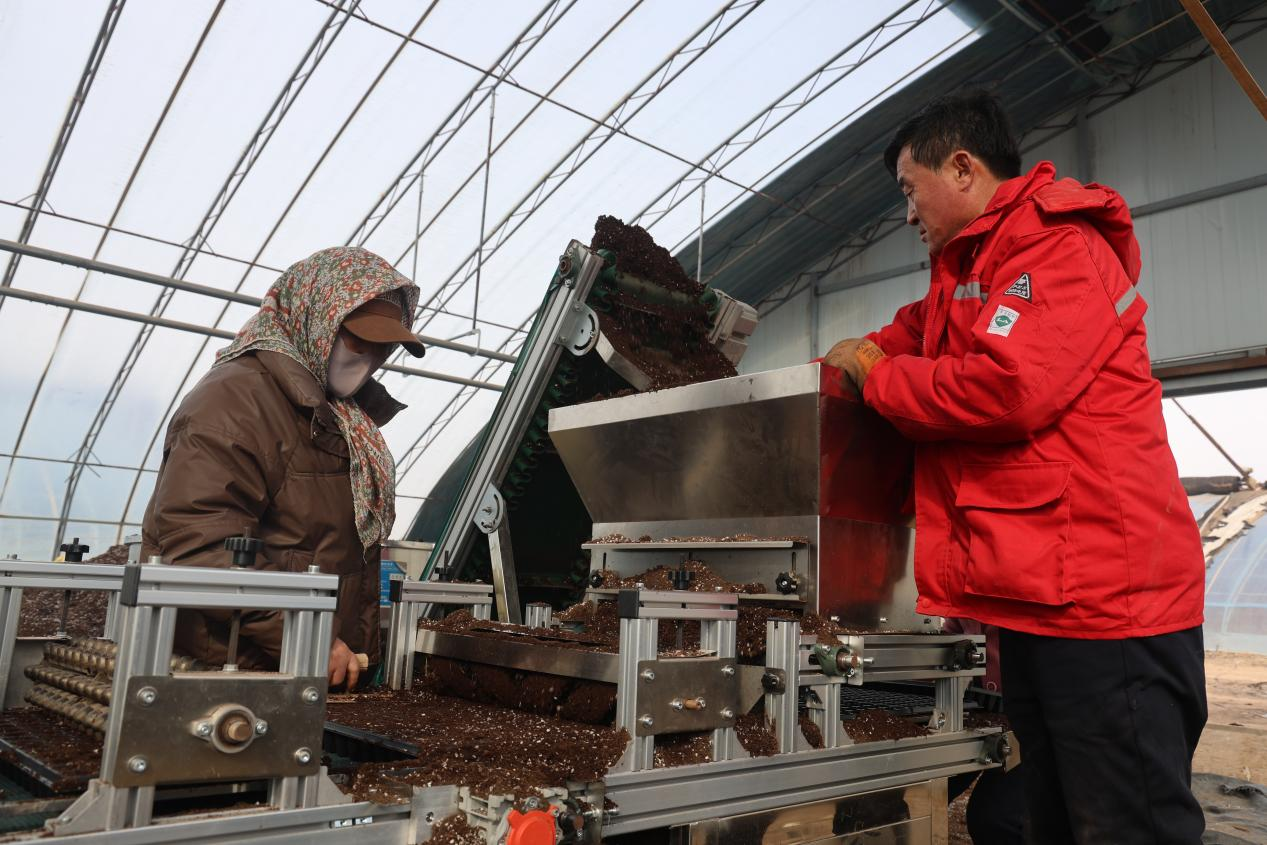 “我们从去年引进了这条播种流水线,效率太高了。”定边县禾盛源农业农民专业合作社理事长杨喜军看着全自动育苗的景象,难掩喜悦之情,“从装盘、播种到覆土,一个小时能播将近1000盘。以前要是靠人工,最少得三四十名工人,现在大大节省了人工成本和时间。”