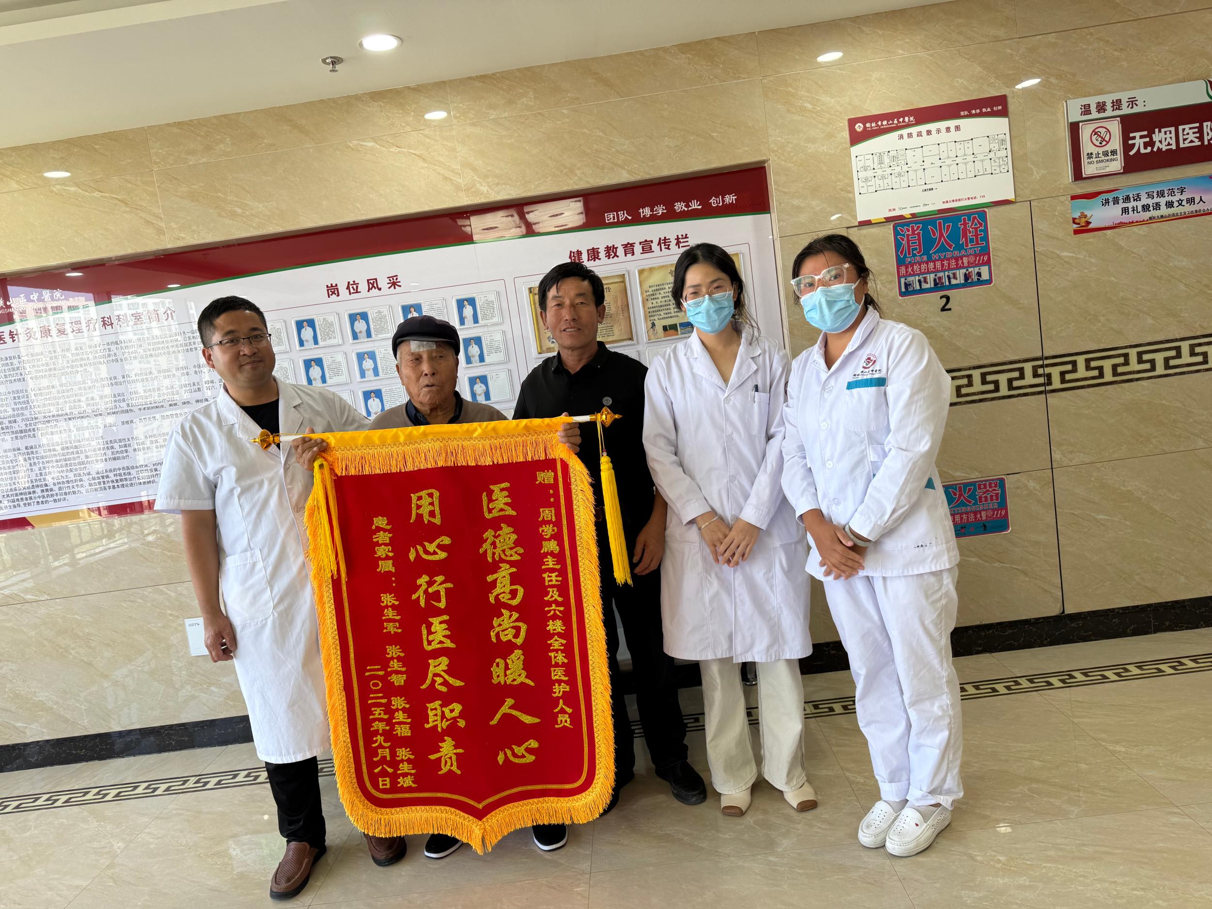 9月9日上午,85岁的张玉明老人坚持亲自将一面写有“医德高尚暖人心 用心行医尽职责”的锦旗,送到横山区中医院周学鹏大夫手中。