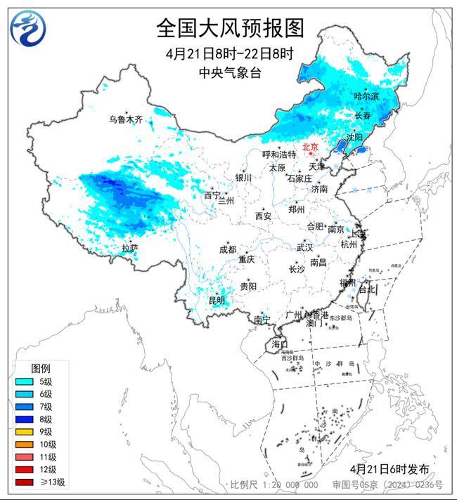 预计,4月21日08时至22日08时,内蒙古中东部、黑龙江中南部、吉林、辽宁以及新疆南疆盆地、西藏北部、青海西部等地部分地区有5~7级风,阵风8~9级,渤海北部海域、黄海北部海域将有7级、阵风8级的风。