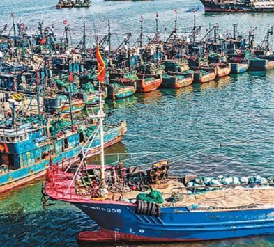 山东省荣成市石岛管理区石岛渔港,渔民忙着往船上装载渔网渔具、加冰加油,为拔锚出海做准备。