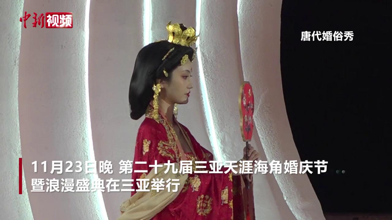 11月23日晚,第二十九届三亚天涯海角婚庆节暨浪漫盛典在三亚举行。现场上演“传统礼赞·时尚婚典”大型婚俗秀,依次呈现唐代婚俗秀、明代婚俗秀、新中式婚俗秀与西式婚俗秀四个篇章,传统礼仪与现代风尚结合,生动展现不同时代与风格的婚俗文化。