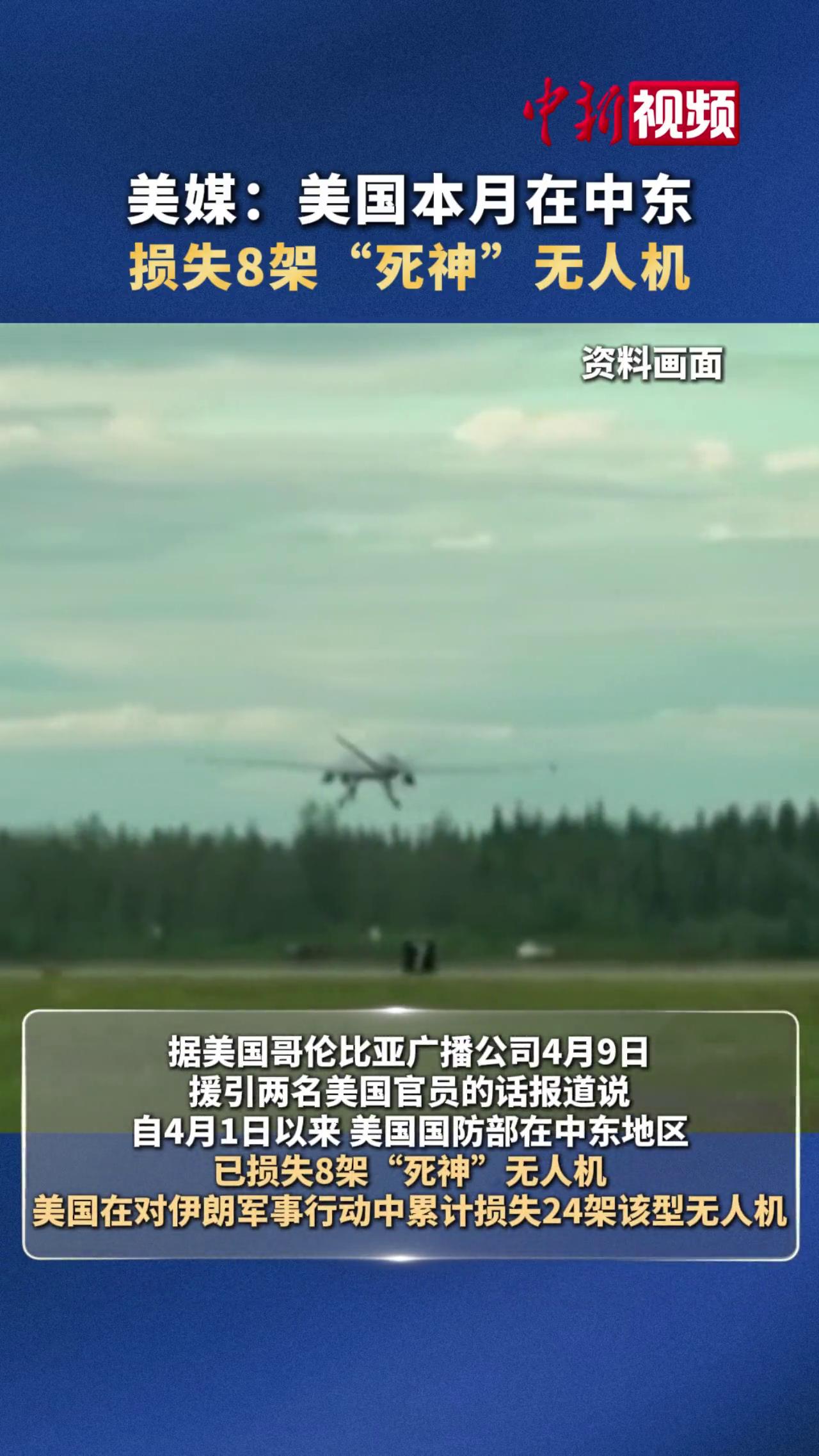 当地时间4月9日,美国哥伦比亚广播公司援引两名美国官员的话报道说,自4月1日以来,美国国防部在中东地区已损失8架“死神”无人机。美国在对伊朗军事行动中累计损失24架该型无人机。