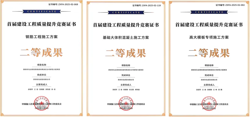 近日,中国施工企业管理协会正式发布《首届建设工程质量提升竞赛活动结果的决定》。中国有色金属工业西安勘察设计研究院有限公司权属陕西有色建设有限公司申报的《钢筋工程施工方案》《高大模板专项施工方案》《基础大体积混凝土专项施工方案》三项成果,均在专项方案赛道中荣获二等成果。