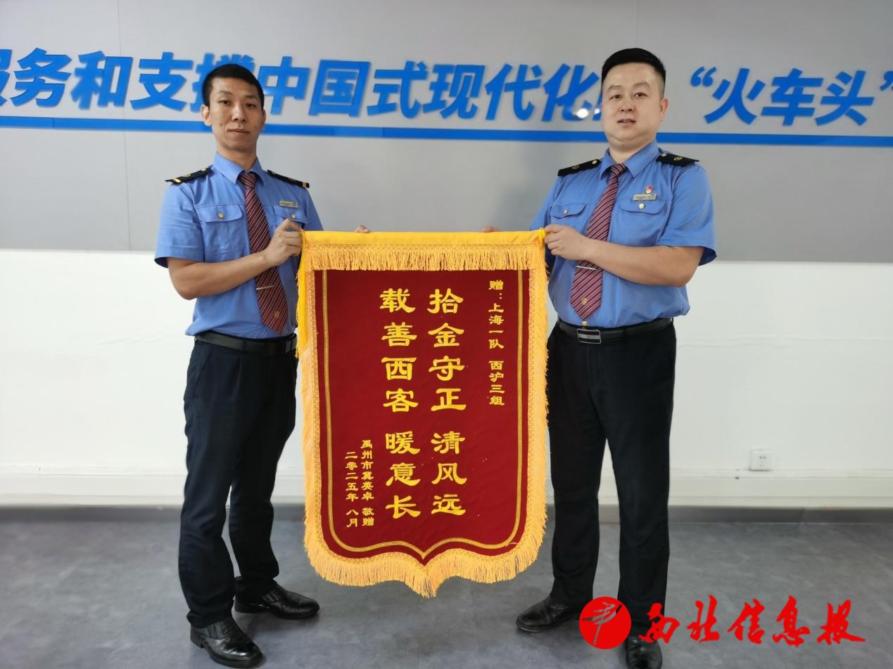 8月20日,陕西省渭南市的一位旅客马女士为上海一队西沪三组赠送了“拾金守正清风远 载善西客暖意长”的锦旗,以表达自己对列车长及乘务工作人员的深深谢意。