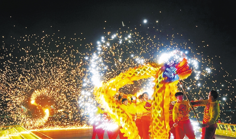 2月14日,在西安昆明池·七夕公园,舞龙表演者为游客献上精彩演出。