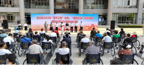7月19日,金台区2023年“双千工程”轮椅、“爱的滋润”物资捐赠暨就业项目扶持基金发放仪式在金台市民中心举办,150余名残疾人朋友和相关人员参加了活动。