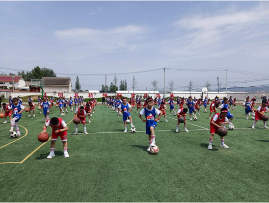 5月30日,宝鸡陇县东南镇杨家坡小学开展形式多样的活动庆祝“六一”儿童节。图为学校特色社团篮球足球操《跃动快乐》表演。(通讯员 梁会平)