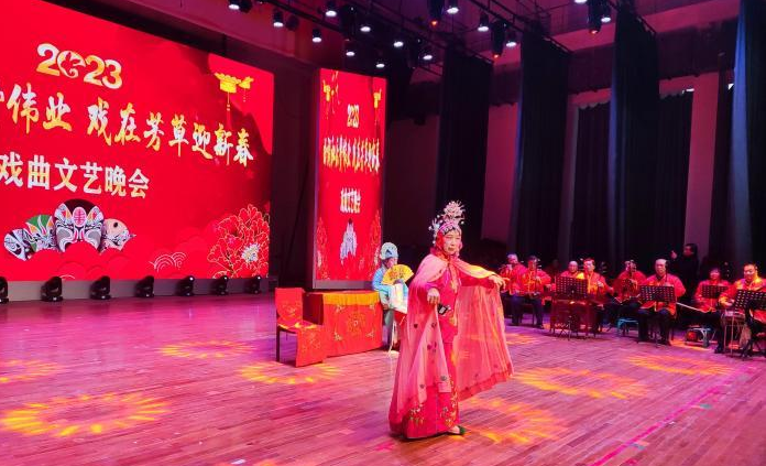 春节假期,新疆五家渠市芳草湖农场长征东街社区文化活动室内,迎新春居民联谊会在欢声笑语中开幕,身着状元服的男演员正与装饰华丽的女演员对唱《花亭相会》。