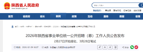 2月12日,记者从陕西省人社厅获悉,根据《事业单位人事管理条例》《陕西省事业单位公开招聘工作人员实施办法》及相关规定,即日起,陕西省各市(区)和省属事业单位2026年统一公开招聘(募)工作人员工作将全面展开。本次招聘(募)计划6490名。