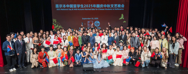 新华网墨尔本9月30日电(记者徐海静)2025墨尔本中国留学生国庆中秋文艺晚会近日在澳大利亚墨尔本杰纳扎诺学院礼堂举行,墨尔本多所高校的中国留学生奉上了一场精彩的文艺演出,喜迎国庆和中秋佳节。