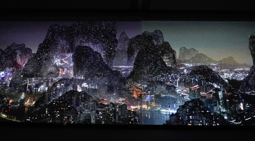 在“贵在意”展览中,除了传统画作,也有承续了写意观念的当代装置、新媒体作品。一幅当代艺术家杨泳梁的“数字山水”巨幅动态影像作品将宋代山水画和现代都市夜景相融,吸引不少观众驻足。
