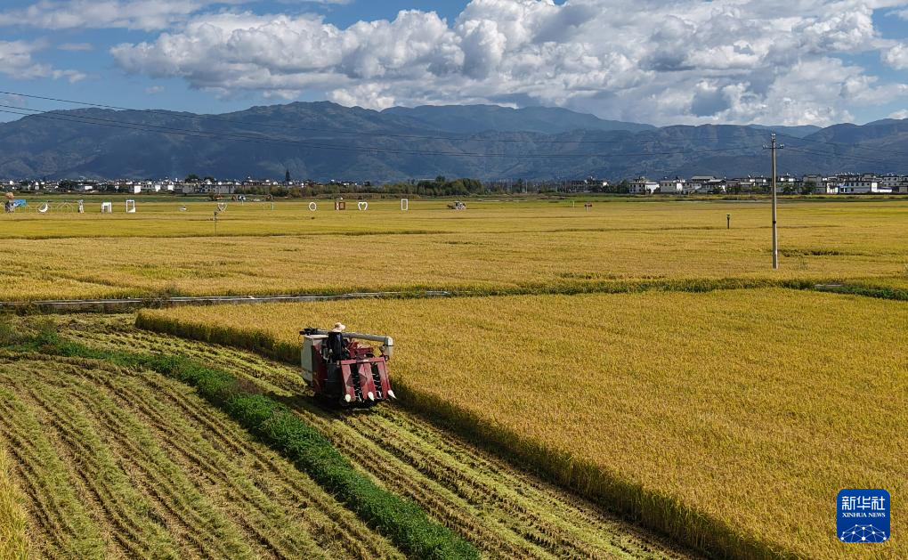 10月10日,工人在云南省大理市喜洲镇水稻种植基地收割水稻(无人机照片)。新华社发(梁志强摄)