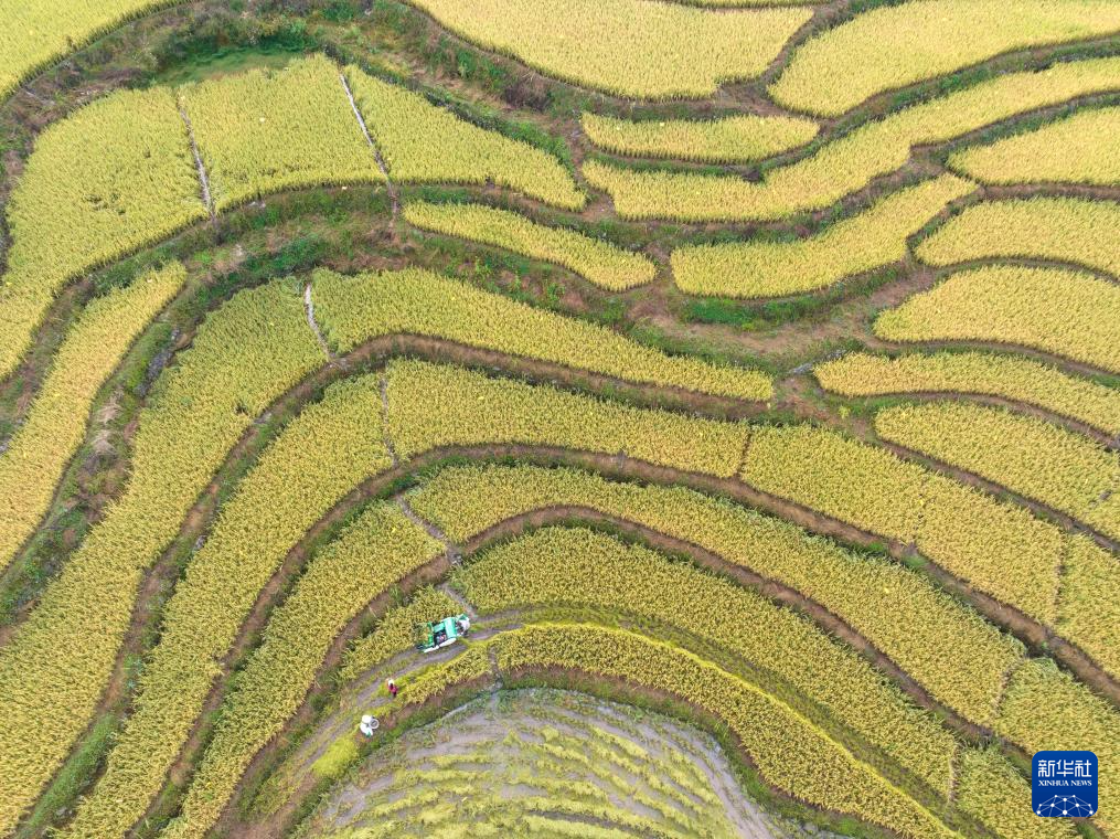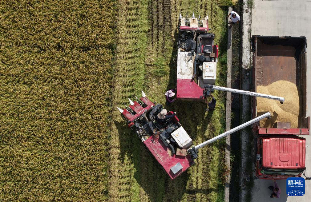 10月10日,湖北省宜昌市秭归县沙镇溪镇长春村村民驾驶农机在田间收获水稻(无人机照片)。新华社发(雷勇摄)
